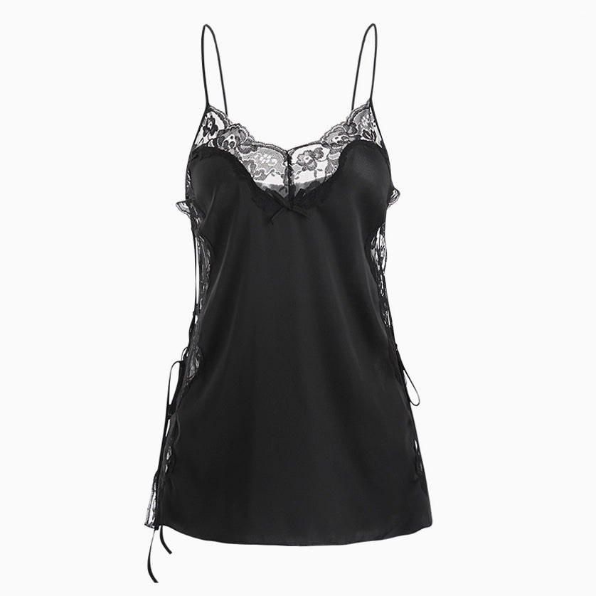 This mini slip dress is such a flirt. Made of stretchy lace and nylon. embellished with lacing detailing sides with scalloped lace trim. featuring a deep V necklace with slender adjustable straps. a relaxed fit and a short hemline. Find more unique women's nightwear chemises or chic lingeries in our boutique. and finish a trendy sultry-sexy lingerie outfit with a pair of matching briefs.