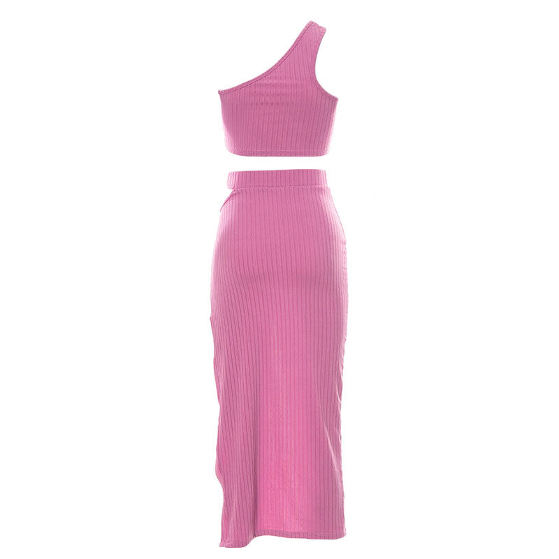 This solid-color matching set is the perfect expression of chicness. Made of ribbed polyester and elastane. embellished with an asymmetrical single-shoulder design. featuring a fitted bodice structured with a cropped length. and complete a minimalist two piece set with a high rise skirt accented with a flirty cutout and a thigh slit. Find more trendy women's asymmetric matching sets or unique clothing in our boutique. and complete a flattering look with a baguette bag.