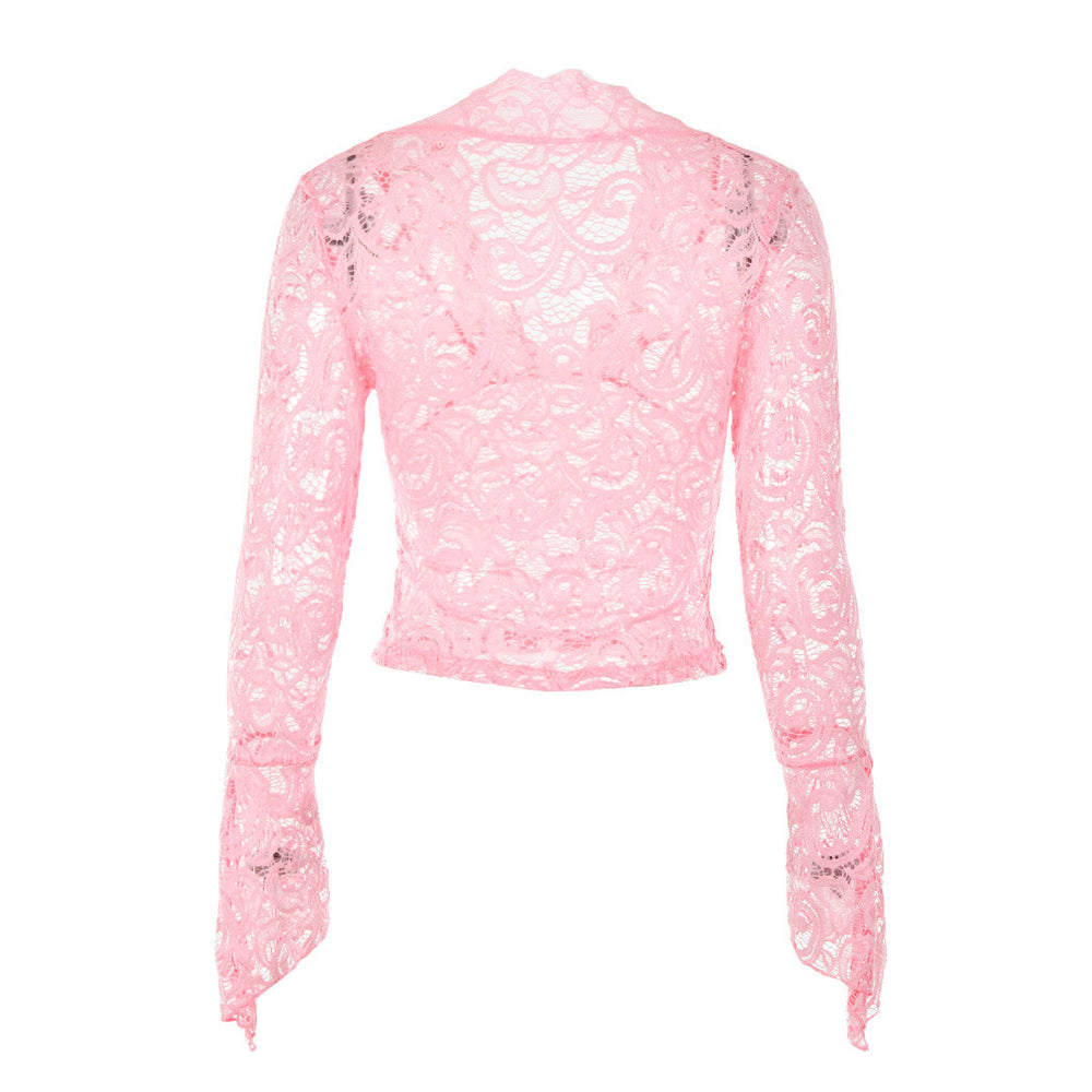 Feel fierce & bold in our sexy sheer crop top. Crafted with delicate lace fabric. this top features a lace long-sleeve design with flared sleeves. perfect for adding a touch of sophistication to your wardrobe. The plunging V neckline is complemented by contrasting lace frill detailing. creating a chic and alluring look that's sure to turn heads. Featuring a pull-on construction. slipping into this top has never been easier. Although unlined. the sheer lace fabrication adds a touch of mystery and allure to your outfit. making it the perfect choice for a night out on the town. We recommend pairing this top with our unique boutiquejeansfor a trendy and fashionable look that's sure to make a statement.