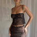 Our alluring black sheer lace tank top elegantly transitions from romantic dinner dates to the bar. Get ready to steal the spotlight! This trendy super short top features delicate lace flower pattern fabric that adds a touch of elegance and allure to your ensemble. Adjustable spaghetti straps ensure a comfortable and customized fit. With partial lining. this top leaves just enough to the imagination. But what sets it apart is the unique split and sexy open back. creating a tantalizing glimpse of skin. It's the perfect choice for a girls' night out or a special occasion where you want to make a statement. Pair it with oversized cargo jeans or a satin fishtail skirt for a stunning and unforgettable look.
