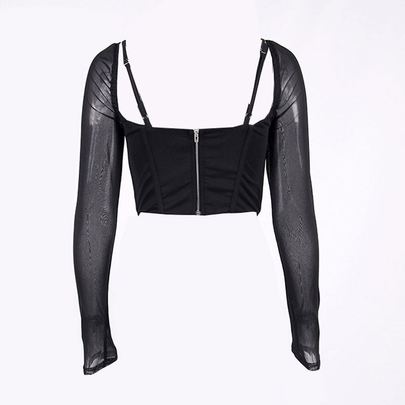 Celebrate your happy moments in this paneled top. Made of sheer mesh and polyester. embellished with sculpted boned bodice tailored with unique lightweight long sleeves. featuring a gorgeous square neckline followed by ruching detailing at the front. adjustable shoulder straps. a curved hem and midriff cutouts at the waist. Find more trendy women's long-sleeve tops or clothing in our boutique. and achieve a chic look with high-waist mini skirts or denim shorts.