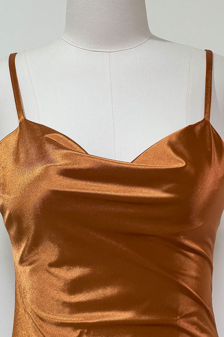 Silky satin slip dresses for women are the definition of and ease. All eyes will be on you in this silky cowl neck spaghetti strap side slit satin slip midi dress. Finished with an irregular neckline. adjustable dainty shoulder straps. silk-like satin fabric. an invisible zip closure at one side. figure-hugging silhouette. a chic side slit and long length hem. this sleek boutique outfit will make your dress the talking point of the evening. Just add stilettos for your next cocktail party beyond summer.