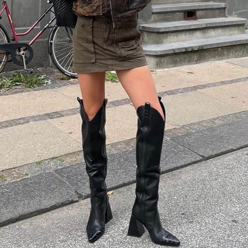 We are absolutely. positively obsessed with these knee-high boots! Made of PU leather. cotton blend and rubber. stand out in a sinuous flared block heel. featuring a pointy layered upper dotted with fancy stitch detailing. a soft footbed. a synthetic leather shaft trimmed with a pull-tab at the curved collar. a slouchy pull-on styling embodied with an over-the-knee shaft. ending up with a rubber patch. Find more trendy women's geometrically heeled boots and unique shoes in our boutique. and style them with a backless mini dress and a strawberry cardigan - Heel height: 9.5cm.