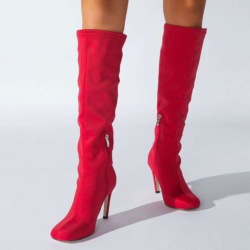 We are absolutely. positively obsessed with the high-heel boots! Made of a polished but not too sheen fabric and rubber. embellished with a architectural covered heel designed with a rubber heel cap. featuring a square closed toe. an upper dotted with bold seamed stitch detailing. a slightly cushioned footbed. a randomly scrunched shaft structured with a half-zipper at side. Find more trendy women's stiletto boots and unique shoes in our boutique. and wear them with a ruched mini dress and a shoulder bag for an edgy look - Heel height: 9cm.