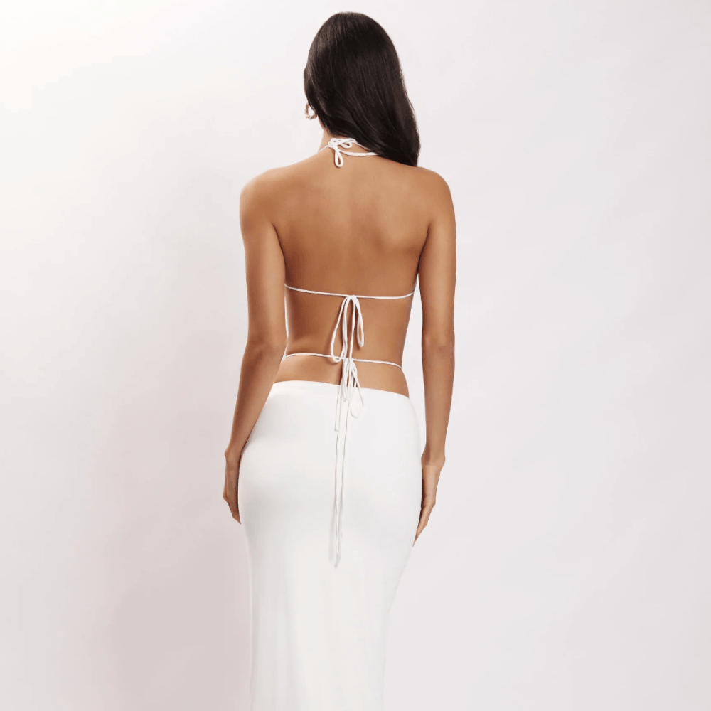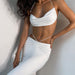 Snowflake Ruched Detail Bodycon Two Piece Set features a halter neckline with barely-there straps. ruched side detailing and a self-tie open back.