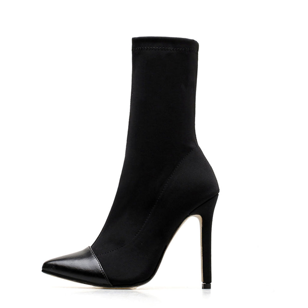 This pair of vegan leather panel boots is classic and elegant. Made of blend PU leather. stretchy blend-cotton and rubber. stand out in a sleek profile. featuring an ankle-height topline with a slip-on styling. sharp pointed toes to the front. and stiletto heel soles along with rubber heel caps. Find more trendy women's ankle boots and unique shoes in our boutique. and wear it with a pair of your favorite leather shorts to create a modern look - Heel height: 11.5 cm.
