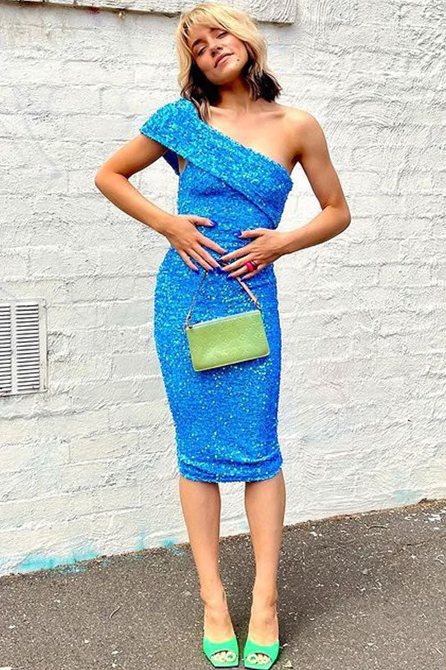 From classic black and clear blue to sweet pink and romantic purple. galaxy sequin dresses are a surprise for the party season. This sparkly sequin one shoulder velvet midi dress will charm when you dance and dazzle when you walk. Designed with a single-shoulder neckline with a draped front. a bodycon silhouette with a zip closure at back and sparkling sequin embellishments. and a mid-length dress cut. this stunning & feminine cocktail party midi dress in our boutique is party-ready yet striking for women. Team it with matching heels for a stunning outfit for your evening plans.
