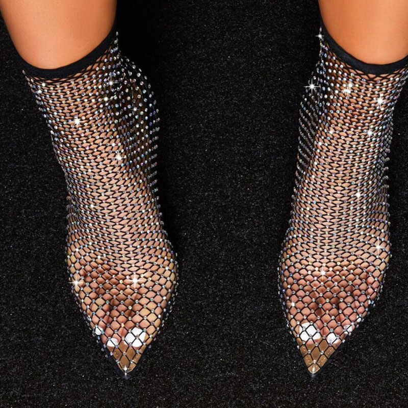 Add a bit of glitter to your ensemble with these ankle boots. Crafted with blend mesh and rubber in solid color. stand out in a glittering see-through profile. featuring an ankle height top line. sharp pointed toes to the front. a zip fastening to the rear. and stiletto heel soles along with rubber heel caps. Find more trendy women's ankle boots and unique shoes in our boutique. and wear yours with your favorite minidress to channel a stunning party look - Heel height: 9 cm.