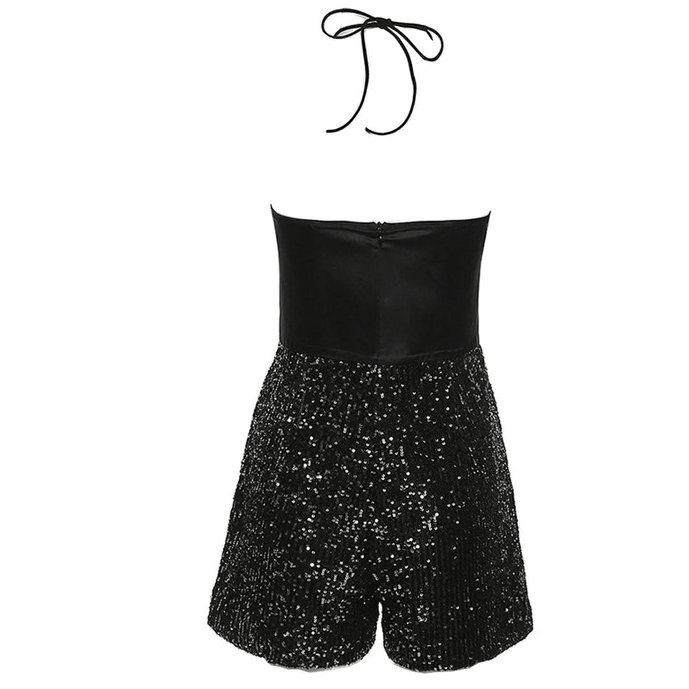 This glittering sequin romper is a picture-perfect piece that you'll love for party nights. Crafted with silky satin and polyester fabric. stand out in a cute. oversized bow applique at the chest. featuring a bandeau top with a halter tie around the neck. a concealed rear zip closure. and a thigh length bottom accented with glistening sequined details in a wide-leg hem. Find more trendy women's statement rompers or unique clothing in our boutique. and easily styled from the party to the street all depending on shoes and accessories.