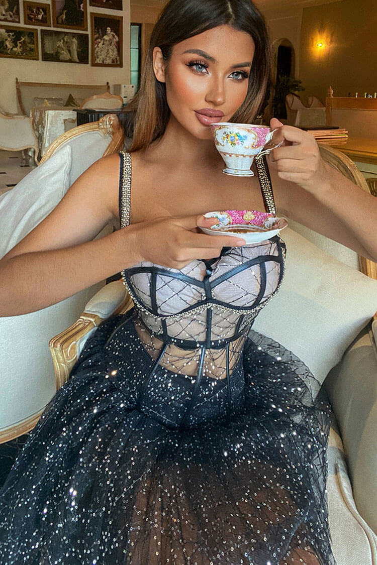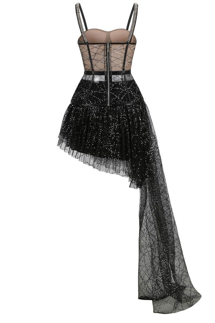 Hunt for your night out looks on glamorous two-piece style dresses. especially this feminine and eye-catching sequined two piece dress for date nights. birthdays. glam functions and events. Valentine's Day. etc. Embellished with glittering sequins overlay. this shimmering little black matching set. for women with tastes. is such a dark romance outfit throughout the year. having a semi-sheer boned corset top in a PU seamed profile. silver-tone rhinestones and beads traced the sweetheart neckline and the suspend shoulder straps. an exposed zip closure at back. and the high waist tulle skirt with a hidden side zip closure in asymmetrical hem lending an ethereal transitional look. Style it with stiletto heels and tonal statement earrings.