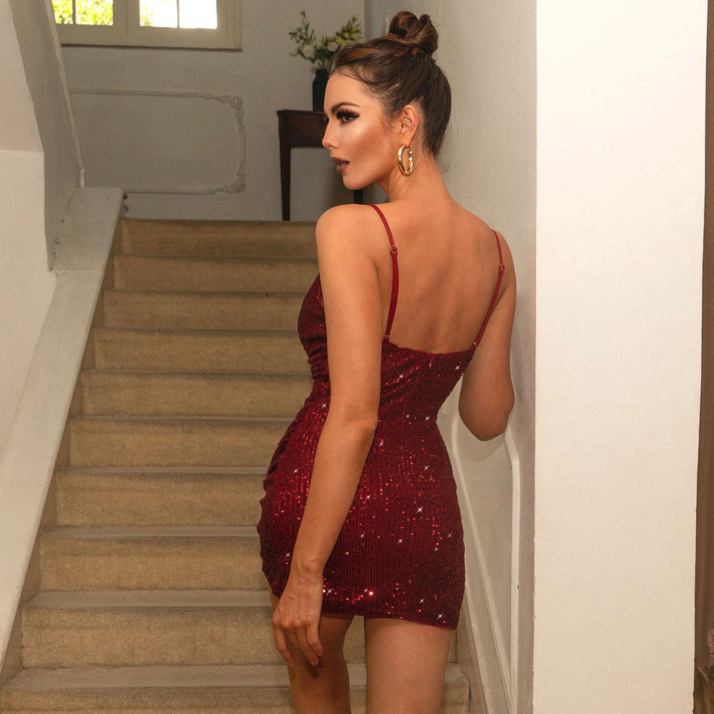 The one-of-a-kind sequin club mini dress is a design you should be aiming to wear like crazy! Crafted with polyester and elastane. stand out in a plunging v neckline. featuring a sleeveless bodice structured with adjustable shoulder strings. exquisite gathered trimmings at the side. a concealed zipper at the back. a bodycon profile blanketed with tonal gleaming sequins throughout. a sexy tulip hemline finished with a short length. Find more trendy women's slip sequin dresses or unique clothing in our boutique. and wear this v-neck dress with a pair of knee-high boots for an outstanding look.