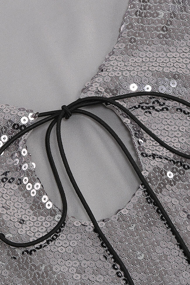 Step into the spotlight with our glamorous sequin dresses this season! This modern style sequin mini dress in our boutique is a piece you will reach for again and again. The black and gray color combination is both sleek and modern. making this cocktail party mini dress the perfect choice for fashion-forward women. The self tie at front with a keyhole and split flared long sleeves add a touch of playfulness. while the sequined-embellished slim fit and the short dress cut create a and stunning look. Pair this dazzling statement outfit with strappy heels and a chic clutch for a night out on the town or a special occasion next time.