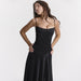 All black sleeveless maxi dresses are perfect for any special occasion or event in summer. and this stunning little black dress is a must-have outfit for any fashion-forward woman's wardrobe. This glamorous slip maxi dress in our boutique stands out with its exquisite details. including a U-shaped neckline. dainty spaghetti straps that highlight the shoulders and neckline. and a fit-and-flare design adorned with textured pintucks at the slim bodice. in additional. its unique drop waistline. the lace-up closure at the back. and the flowy. floor-length dress cut that enhances the gown's movement and grace. exuding an air of sophistication and elegance.