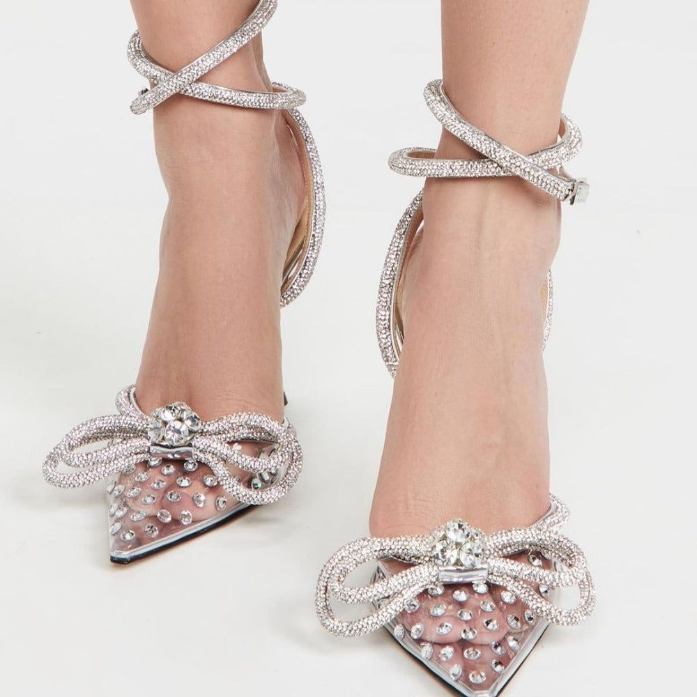 'Showstopper Heels' are a brand signature �the hotly-coveted pair is enough to elevate jeans and a tee to scintillating heights. This iteration is made from PVC embellished with a crystal-encrusted silver rope that wraps around the ankles and pointed vamp.
