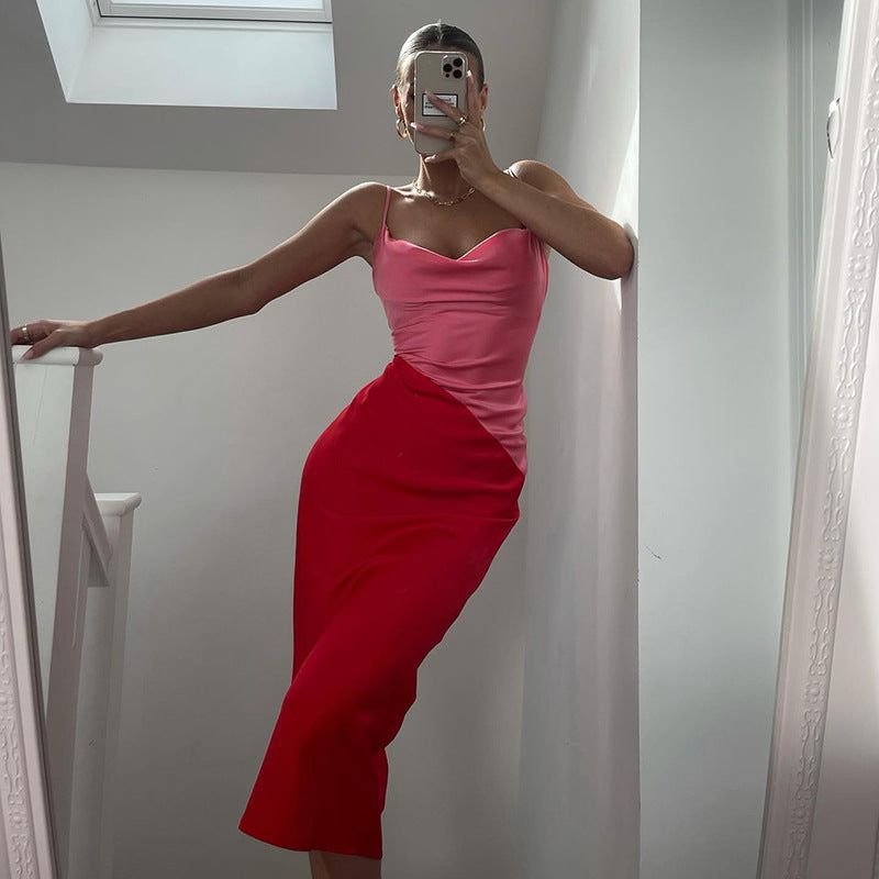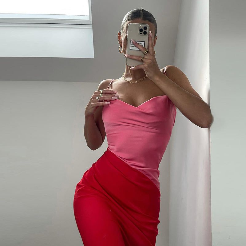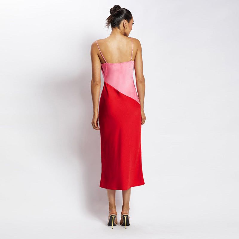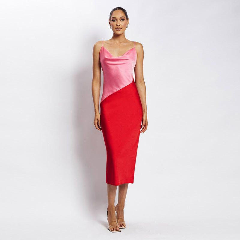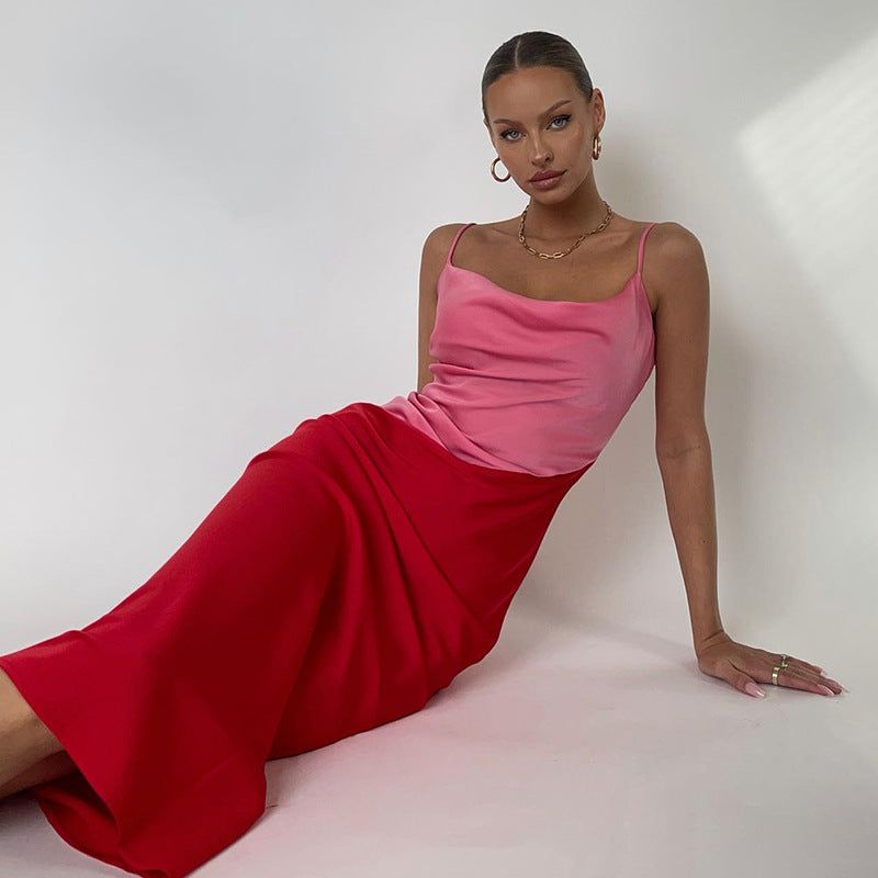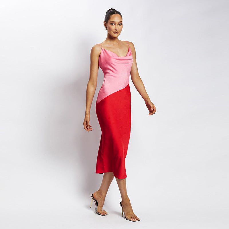 Made for long lunches thatturninto sunset soirees. the Strawberry Fields Satin Dress is asophisticatedtake on occasion dressing. Features a cowl neckline. adjustable shoulder straps. and adiagonal dual-tone design. We're styling ours with goldjewelry and barely-there mules.