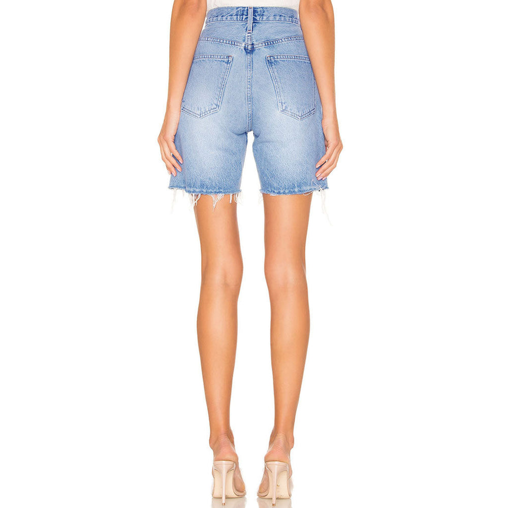 This simple pair of denim shorts brings an athflow style to your daily outfit. Made of blend denim and polyester. stand out in an elongated length. featuring a high rise waistband trimmed with belt loops. a button closure along with a concealed zip fastening to the front. classic five pockets. fading and whiskering details. and a straight leg cut accented with frayed hem. Find more trendy women's denim shorts or unique clothing in our boutique. and look more expensive with basic tops than they are.