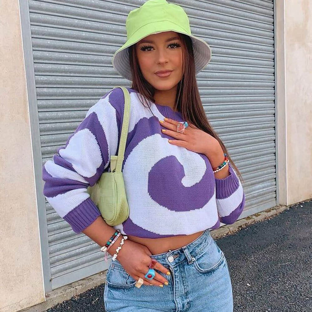 The eye-catching knit top is perfect pick for street style. Crafted with blend acrylic and polyester. embellished with a huge whirlpool pattern allover. featuring a stylish fit with special print knit structured with a ribbed crew neckline. long blouson sleeves and ribbed cuffs. and a regular length accented with a ribbed hem. Find more trendy women's sweaters or unique clothing in our boutique. and equally chic for lounge or work.