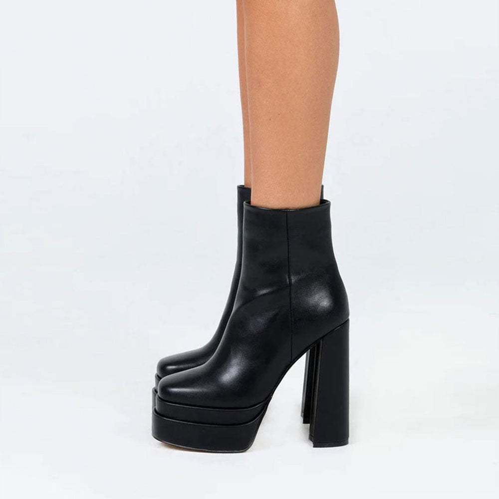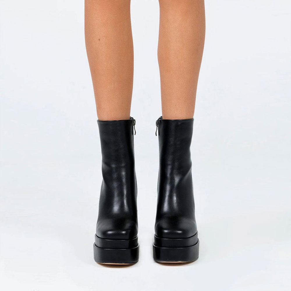 Your autumn & winter looks are about to get even more beautiful thanks to the minimalist boot! Made of PU leather and rubber. stand out in a mid-length shaft anchored by a structured high heel. featuring a square almond toe enhanced by a sturdy platform. a comfy cushioned footbed. a side zip closure that is for an easy on and off. finished off with a rubber heel cap. Find more trendy women's ankle boots and unique shoes in our boutique. and try them on with a backless mini dress and a strawberry cardigan - Heel height: 14.5cm.