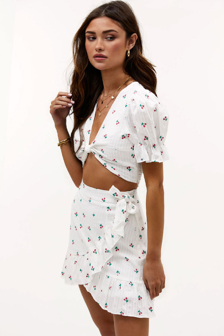 Cute outfit ideas with cherry print two piece dresses! This sweet cherry puff sleeve ruffle high waist mini two piece dress is show-stopping. Designed with lightweight ribbed fabric. a cropped top with a knot at front. puff sleeves with ruffle cuffs. the matching skirt with a high rise waist. a bow tie at front with cascading flounce brim. this boutique two piece set is a sweet staple of summer. Wear it with slides or stilettos on your own.
