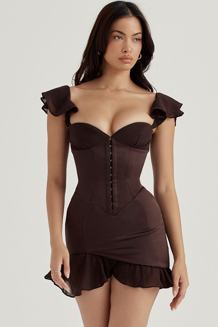 Silky satin slip dresses have been popular. with the versatility from day to night. the street to the party with ease. Let's go dancing with this '90s flirty slip mini dress that women can absolutely still wear this season! Featuring a two-tone sweetheart neckline with frill details. swingy ruffled trimmed straps on the shoulders or off the sleeves on your own. a decorative hook-and-eye closure at front along with a drop waistline. a slim fit silhouette with a hidden zip closure at back. a mix of polished satin and thin chiffon. and an asymmetrical short dress cut with flowy flounces. this night luxe bodycon mini dress in our boutique is such a stunner for a disco ball or one that's classic and comfortable enough to dance. As for styling a party-proof outfit? A simple to complete the look with glittery eye makeup from the night before and a pair of high heels.