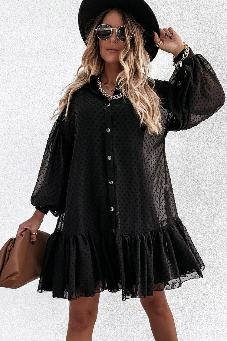 Little black dresses have practically become one of the foundations for the city girl's wardrobe. Babydoll silhouette makes this swiss dot high neck button down bishop sleeve mini dress more cozy and cute. Featuring a mock neckline with single-breasted at front. long bishop sleeves. shapeless silhouette with flutter flounce hemline. allover swiss dots mesh fabric with lining. and a short dress cut. this boutique summer dress for women is a great LBD from day to night. Match it with a statement necklace and a belt to finish an attractive street outfit.