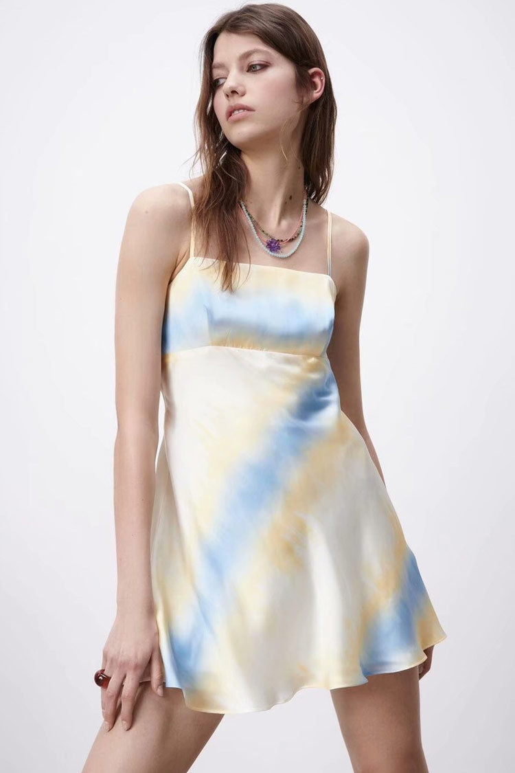 Turn heads in mini slip dresses for women. and you look cute in this tie dye print square neck A-line slip mini dress. Featuring a square neckline with adjustable thin spaghetti shoulder straps. a bodice with smocked back. a hidden zip closure on one side. a high rise waistline with slightly ruching detailing. multi-colored tie-dye patterns throughout. and a short dress cut with a flare hem. this pretty mini dress in our boutique is both ethereal and flattering. Dress it comfortably with casual slides or dress it up with some heels and a mini bag for a more chic outfit in summer.
