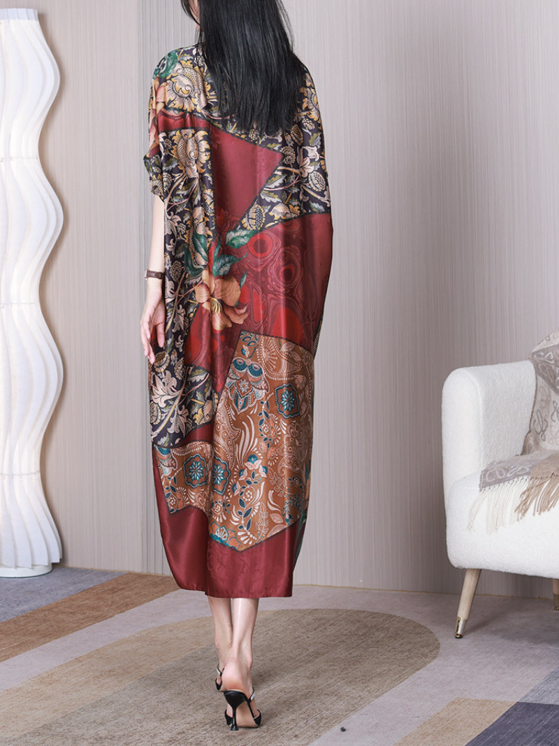 This elegant red dress is crafted from a luxurious blend of 85% silk that drapes beautifully and feels silky soft against the skin. It features a V-neckline that adds a touch of sophistication to the design and is perfect for showing off your favorite statement necklace. The waistline of the dress is loose. providing a comfortable and relaxed fit that is perfect for both casual and formal occasions. The sleeves are designed in a dolman style. which adds a unique touch to the dress and enhances its overall appeal. The dress is adorned with a beautiful floral pattern that adds a feminine and romantic touch to the design. Whether you're headed to a garden party or a wedding. this dress is sure to make you feel beautiful and confident.