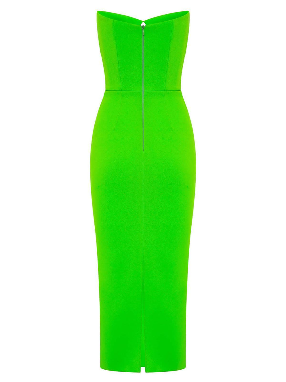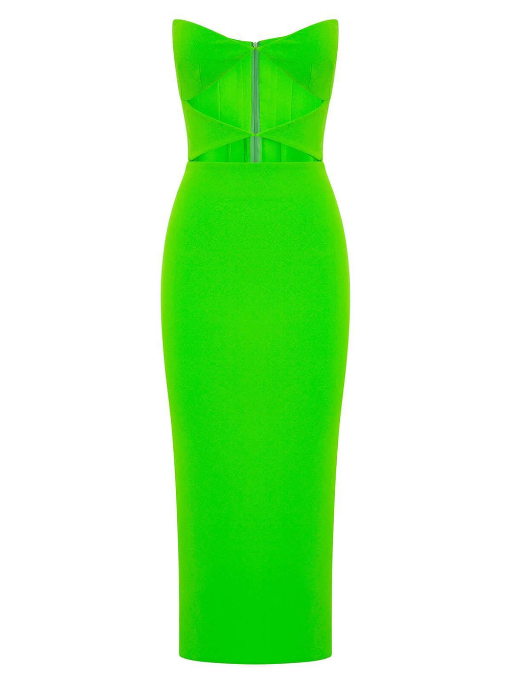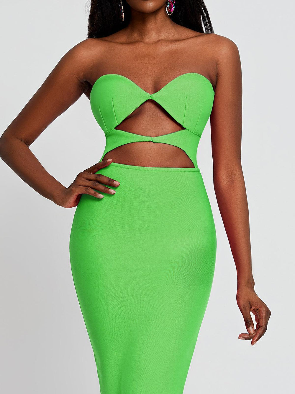Our Uma Strapless Cutout Bandage Dress In Green is both chic and sexy and designed to accentuate your curves. Cut from the body contouring bandage fabric. this beautiful dress is designed to shape and smooth your body from within. It features a two of daring cutouts to the front that highlights your figure.