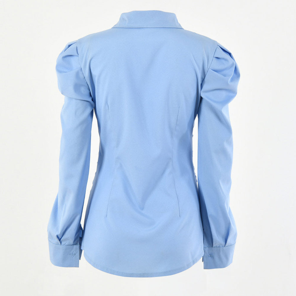 This unique shirt exudes an effortlessly chic look. Made of cotton blend and polyester fabric. embellished with gathering details to the front. featuring a slim fit cut structured with a point collar. a concealed button placket to the front. puffy sleeves tailored with buttoned cuffs. Find more unique women's shirts or trendy clothing in our boutique. and tuck in your denim and add a pair of chic heels.