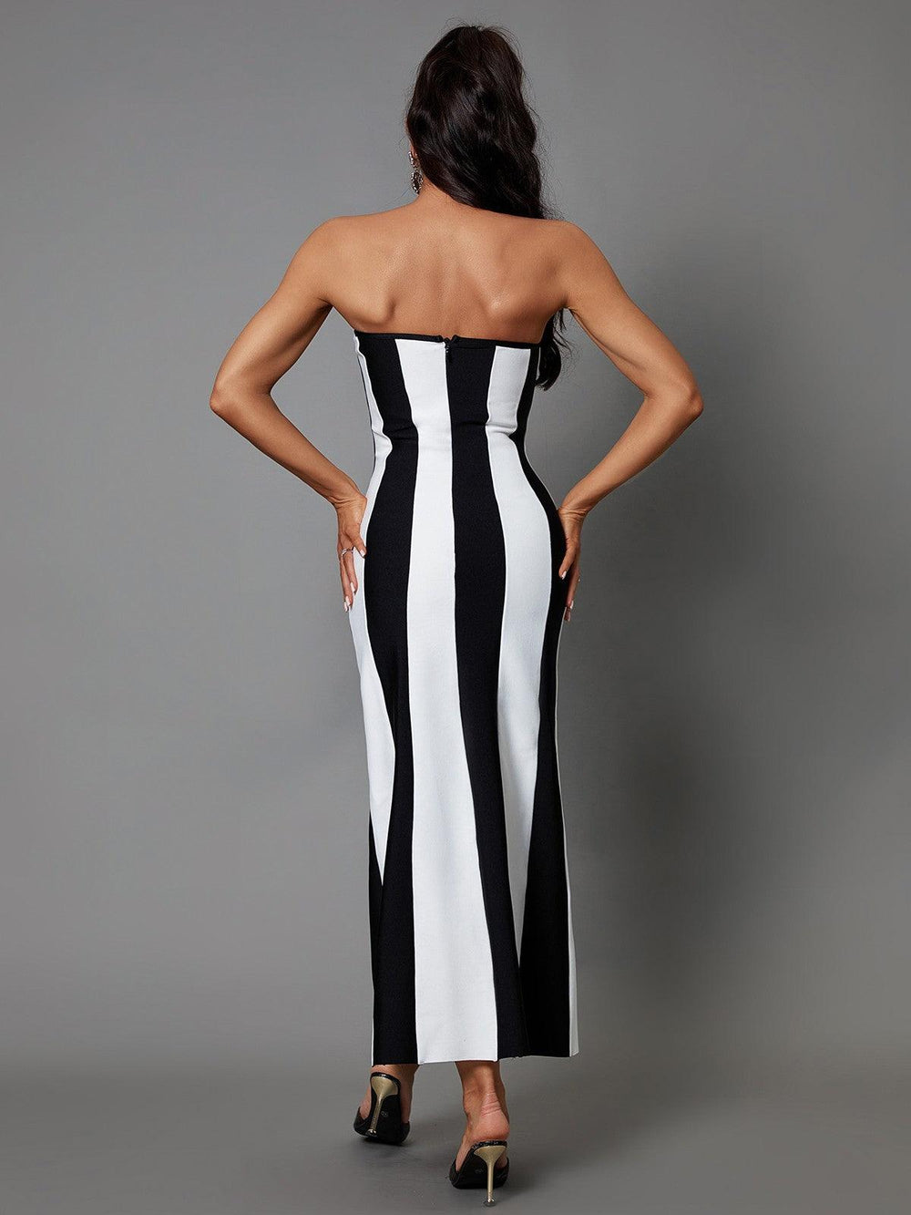 Look stylish and chic in the Vashti Strapless Bandage Maxi Dress. This timeless piece features a strapless design and a bandage fabric construction that has a flattering fit and maximum comfort. The black & white design offers versatile styling options. while the maxi length adds a dramatic finish.
