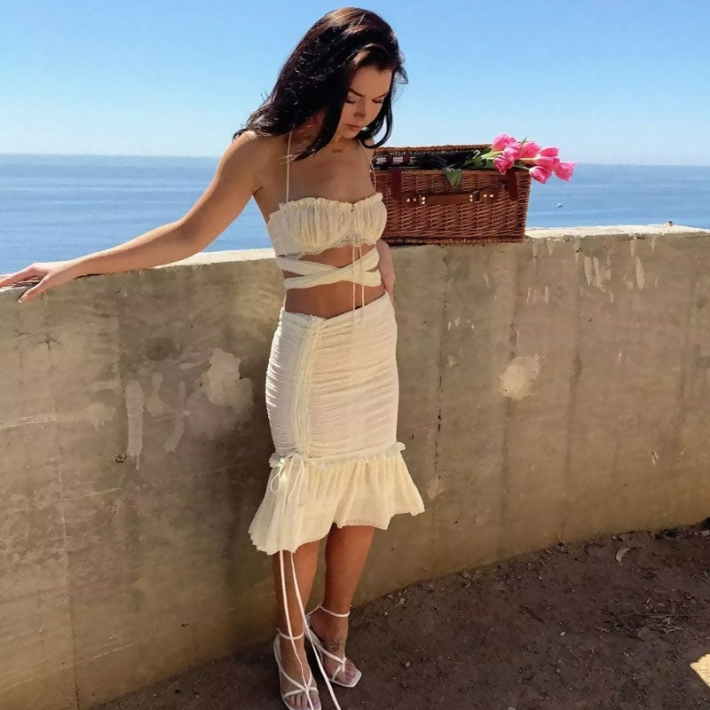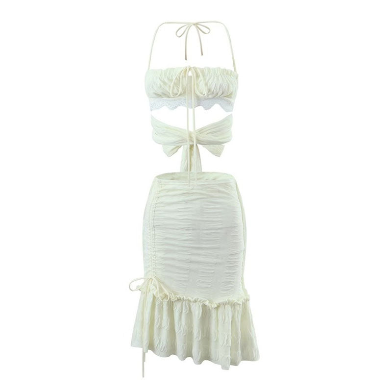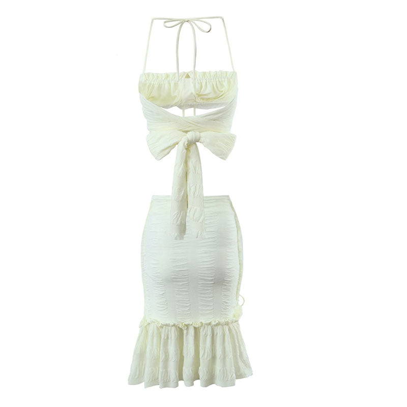 Stand out in any crowd adorning this ethereal textured skirt matching set. Made of polyester and elastane. stand out in DIY wraparound straps adorned with whimsical textures. featuring a bustier-like neckline followed with a halter tie and a drawstring to the front. frilled trimmings along with lacy details. and complete a ruched two piece set with a gathered mini skirt that is blanketed by ribbed and jacquard textures. an offset drawstring to adjust the fit. a flouncy hemline finished with a short length. Find more trendy women's vintage skirt matching sets or unique clothing in our boutique. and complete a gorgeous look with a pair of butterfly high-heel pumps and a choker necklace.