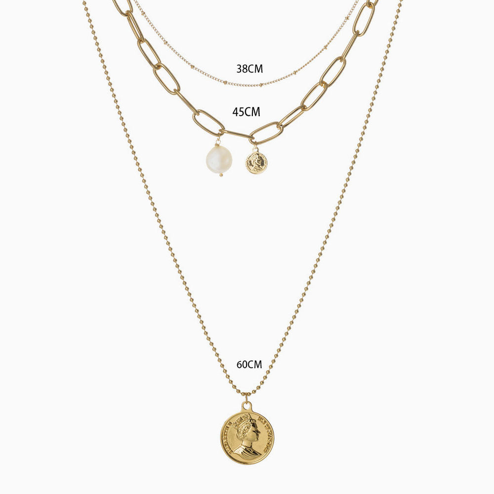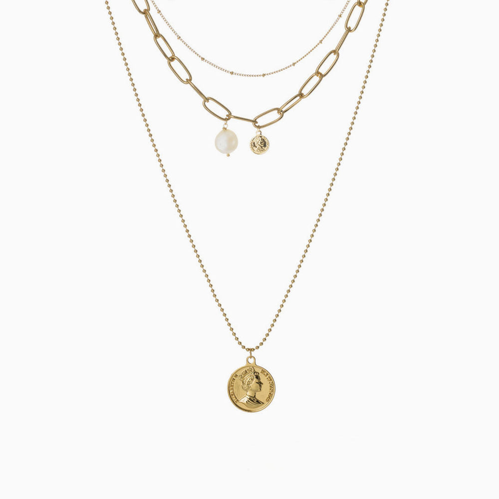 Create an elegant way to do a layered look with this treble necklace. Crafted with gold plated alloy. embellished with in a polished bead and gold-tone coin charms. featuring a treble-strand chain along with an adjustable fit and finished with a lobster-clasp fastening. Find more trendy women's necklaces and unique jewelryin our boutique. and mix and match with other gold chains for a retro look.