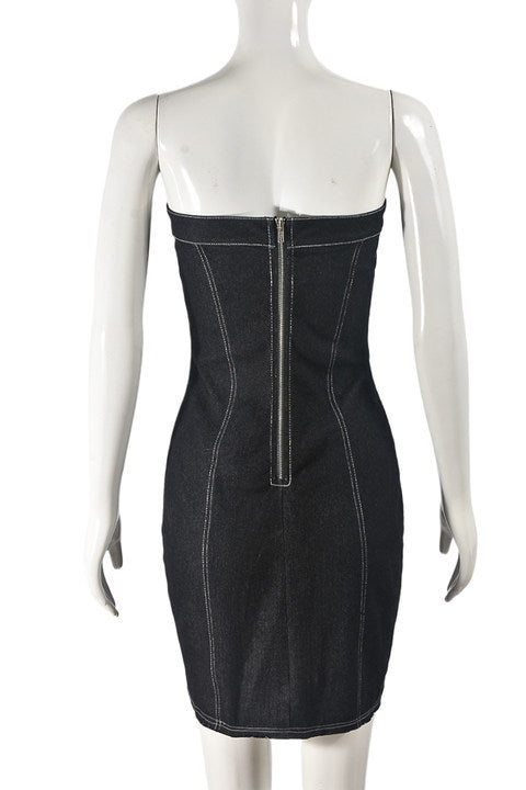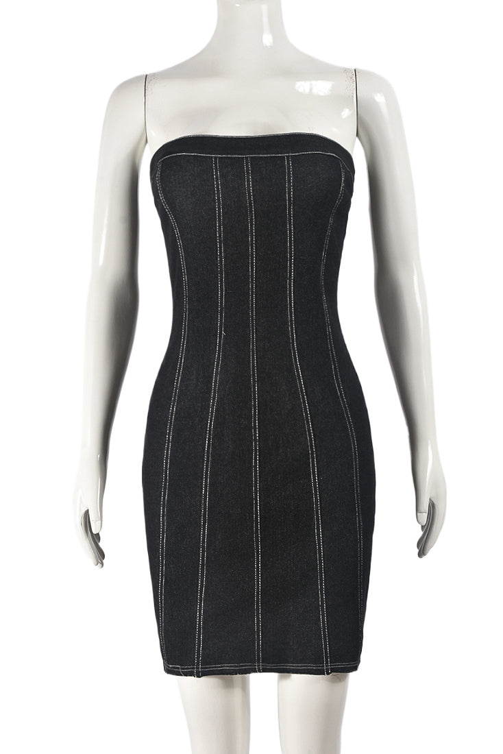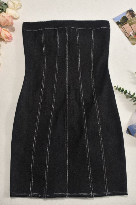 Denim tube dresses can definitely be trendy during the summer season! Crafted from faded denim fabric. this vintage denim mini dress in our boutique is a chic and fashionable summer outfit for any casual or semi-formal occasion. Designed with a banded straight neckline to highlight the shoulders and neck area. the slim-fit silhouette to hug the body and create a sleek and look. and the short dress cut with its frayed edge. which lends a vintage and worn-in feel. this breezy strapless mini dress is a must-have for women. Pair it with sandals or sneakers for a casual look.