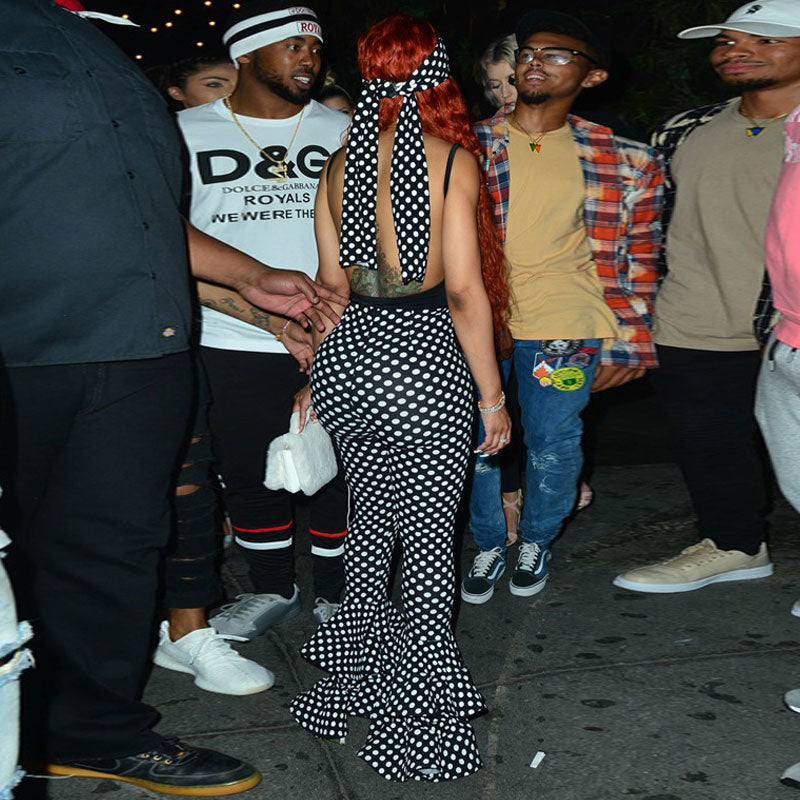 If you want to try the cute-print trend but want to keep it more vintage. this pair of pants is for you. Made of stretchy polyester fabric. embellished with contrast dotted patterns throughout in a shade of white and black colors. featuring a fit-and-flare cut structured with a covered elastic high-rise waistband and the particularly long hems accented with layered ruffles. Find more trendy women's pants or unique clothing in our boutique. and try it with a chic crop top. our all-black slim boots. and our all-black baguette bags.
