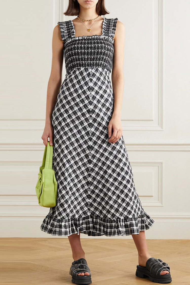 Step into timeless elegance with plaid sun dresses in our boutique. This stunning sleeveless midi dress effortlessly marries traditional design with modern style. making it the perfect addition to any fashion-forward wardrobe. Made from seersucker fabric. this retro style checked midi sundress features a flattering square neckline and suspender shoulder straps with intricate smocked detailing at the fitted bodice. the playful plaid pattern adding a touch of retro charm. while the ruffle-trimmed mid-length dress cut exudes sophistication and class. this breezy summer outfit is both versatile and elegant for women. perfect for a day out with friends or a romantic date night.