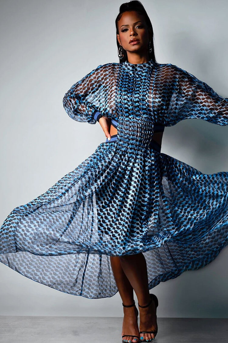 Flowy maxi dresses for your upcoming vacations. You look so enchanting in this wave print cutout long sleeve high neck pleated maxi dress. Featuring a mock neckline with one-button closure at back and pleats detailing at front. long batwing sleeves with elasticated striped cuffs. a cut-out with elasticated striped banding. flattering figure silhouette in lightweight chiffon fabric. blue wave patterns throughout. and a long dress cut. this flattering boutique dress for women make you look fresh and pretty in the journey in spring and summer. Match it with your fave sandals to finish a new vacation-worthy outfit.