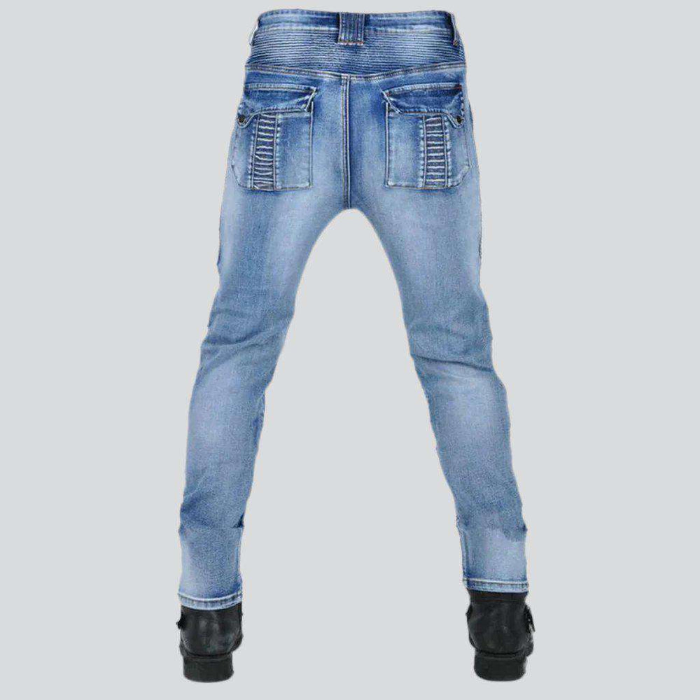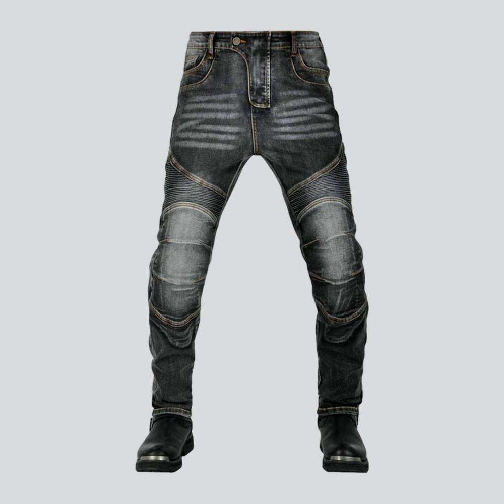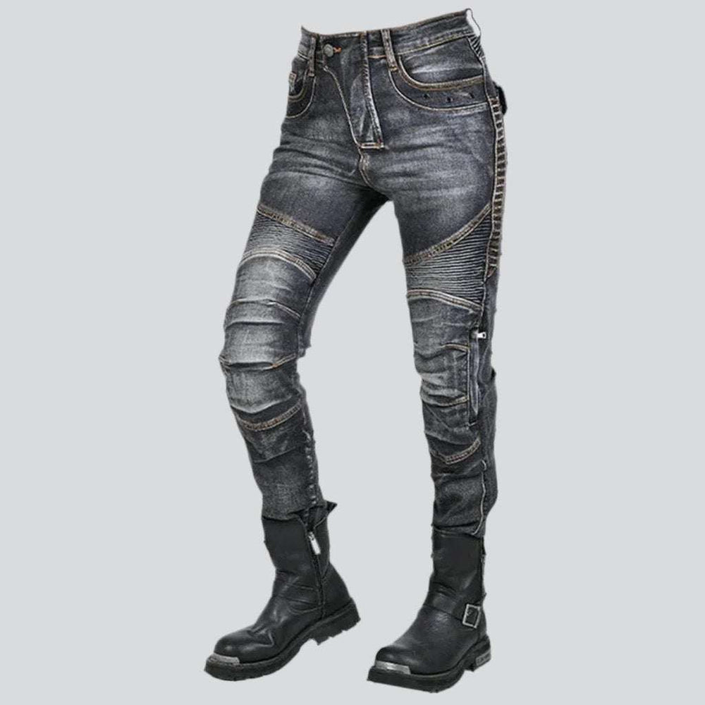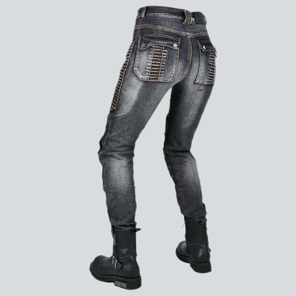 These elevated-waist biker jeans combine the perfect blend of contemporary fashion and nostalgic grunge with a bold. edgy distressed pattern. The slim silhouette ensures that you look chic without compromising on comfort and ease. Crafted with premium quality kevlar denim. the resilient zipper and stylish button closure are designed to last.