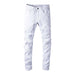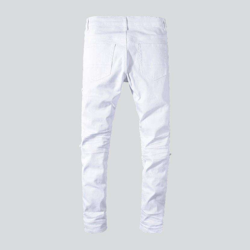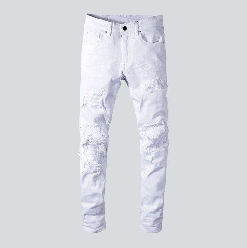 Introducing the 2023 Spring-Summer Collection's White Biker Jeans for Men. a statement piece that adds a touch of enduring elegance to your wardrobe. Featuring a mid-waist cut and skinny silhouette. these versatile jeans are perfect for any occasion.