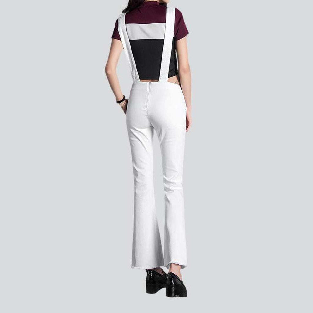 Welcome to the future of streetwear style: our 2023 Spring-Summer Collection white bell-shaped women's denim jumpsuit! Stylish and on-trend. this jumpsuit is sure to make a statement wherever you go. Flaunt your fashion-forward look with this classic monochrome piece. featuring a unique and distinctive design.