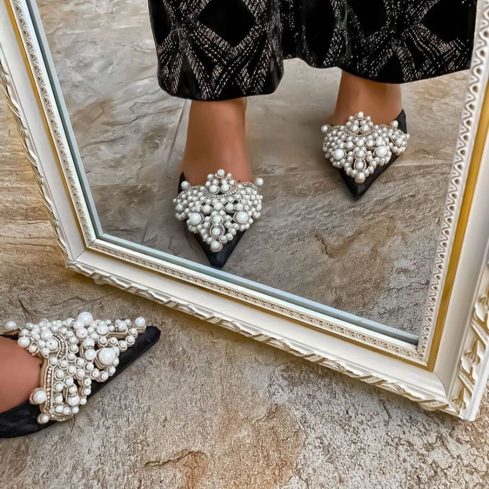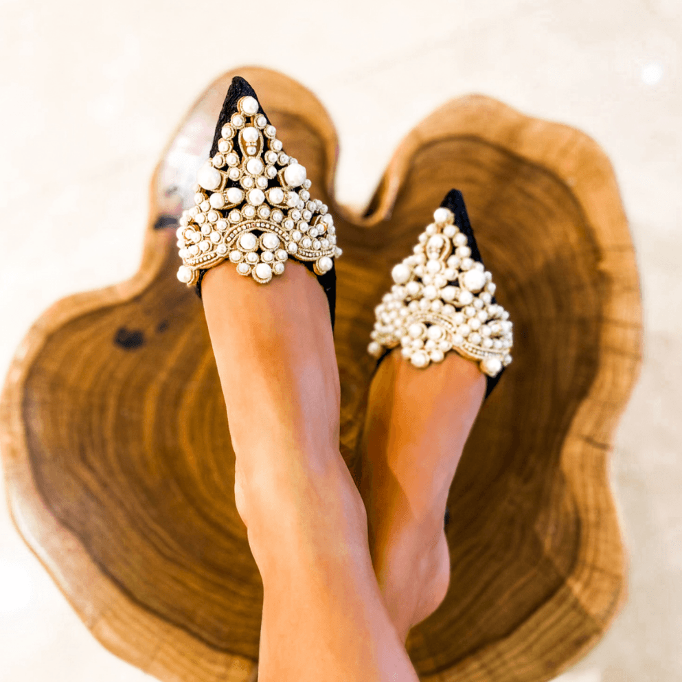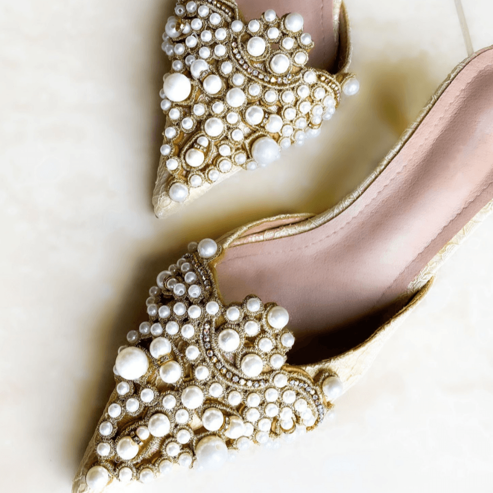 Contrasting gold embroidery. embellished with shiny charms. gleaming rhinestones. and faux pearls. adorn the vamp for a finishing touch!