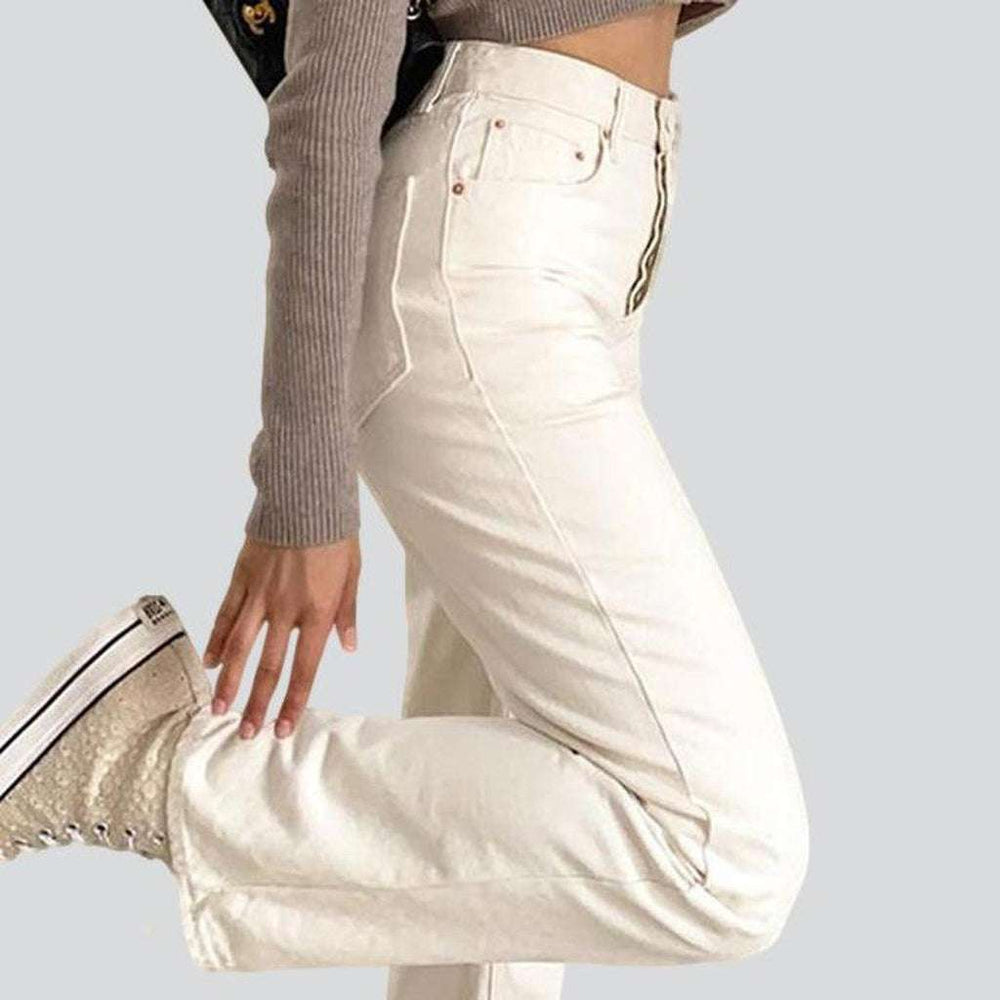 Introducing the latest addition to our 2023 Spring-Summer Collection: the perfect blend of 90s nostalgia and trendy fashion. our monochrome white straight women's jeans! Crafted from luxe denim with a high waist and zipper & button closure. this piece offers timeless sophistication and a bold statement.
