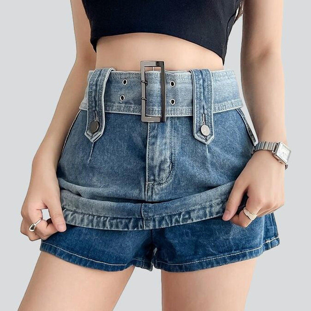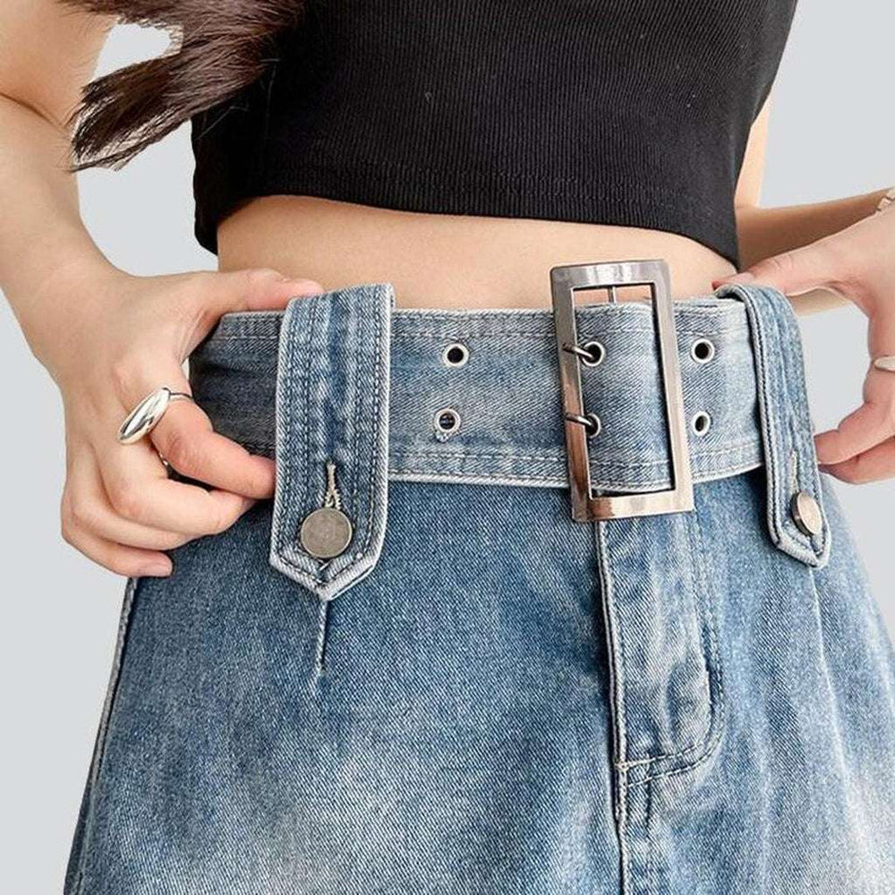 Introducing the edgy-trend 2023 Summer Collection wide belt mini denim skirt �a statement-making piece perfect for the trendsetters and fashionistas alike!