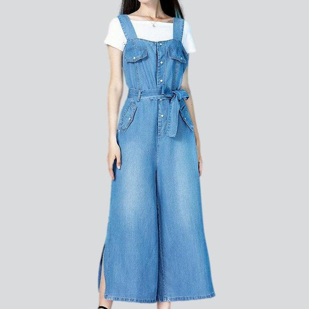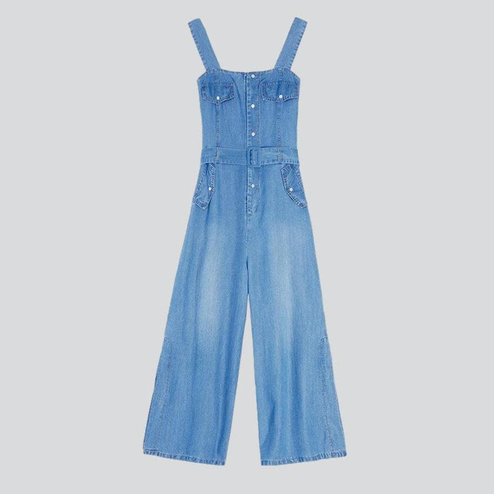 A street-style go-to. this wide-legged jumpsuit is perfect for making a statement and turning heads. It's crafted with a light wash finish and buttoned closure for an extra touch of sophistication. Plus. its suspenders add a playful touch that's sure to bring a smile to your face.