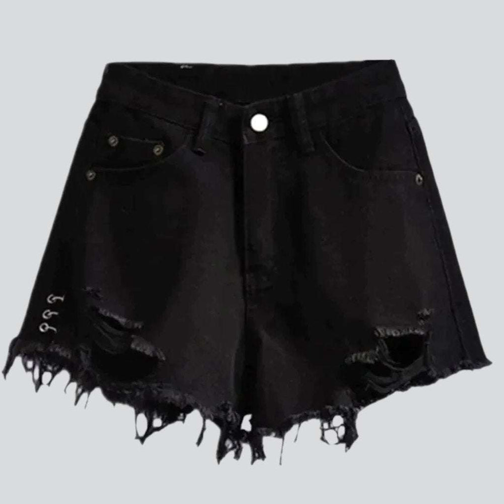 Embrace the perfect balance between vintage and modern fashion with these timeless denim shorts. The wide-leg design gives you a stylish. comfortable fit. while the distressed hem adds a fashionable edge that will turn heads. And the zipper and button closure ensures you look impeccable and feel it. too.
