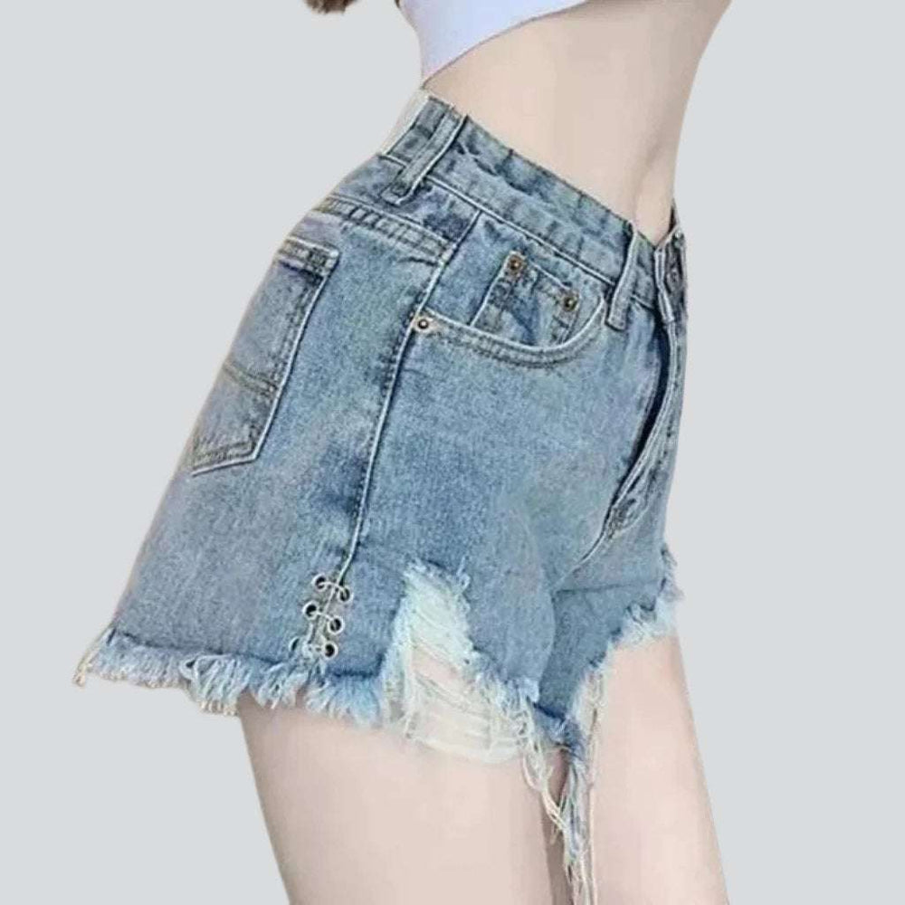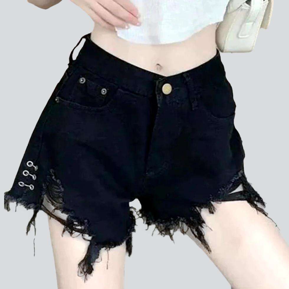 Unlock the trendsetting grunge-vibe of summer with our 2023 Summer Collection wide women's distressed denim shorts! This high-waisted. wide-leg beauty features a zipper & button closure and raw distressed hem for an unforgettable look.