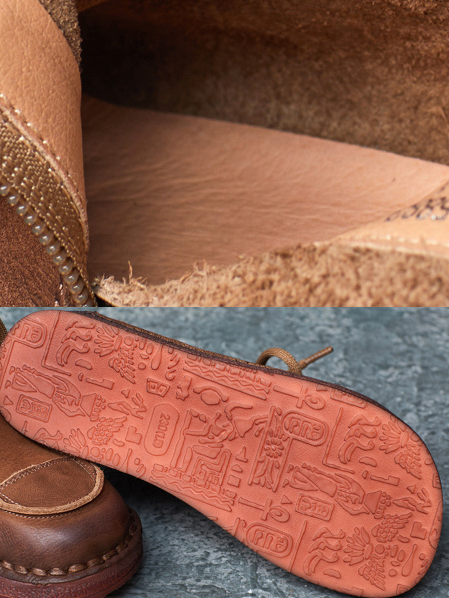 Introducing our Women Winter Retro Leather Spliced Flat Boots. a timeless and sophisticated addition to your winter wardrobe. Crafted with premium leather. these boots exude luxury and comfort. Perfect for any occasion. these boots will elevate your style and keep you warm throughout the season.