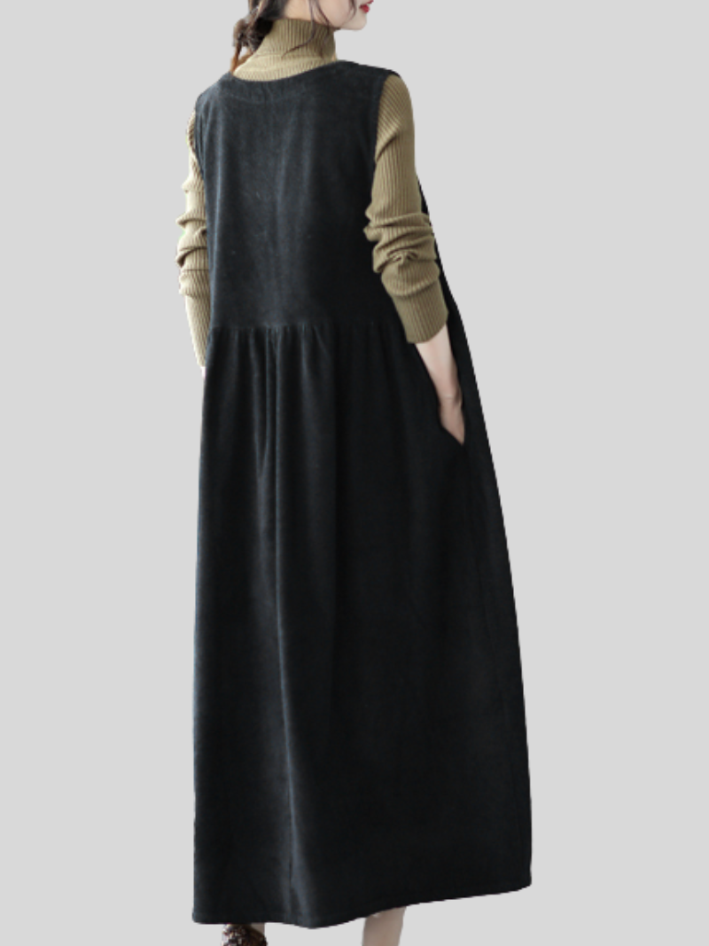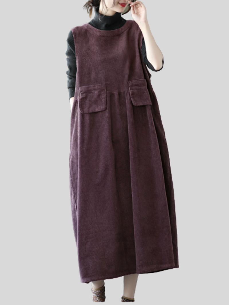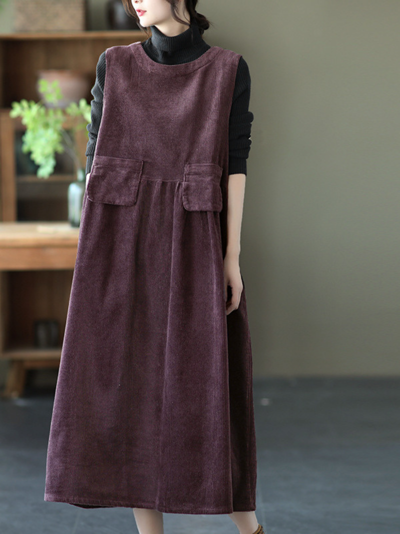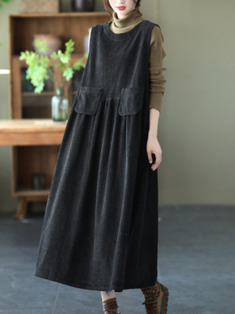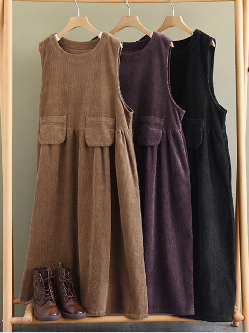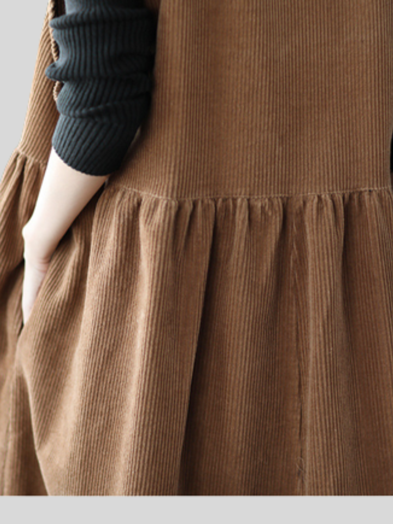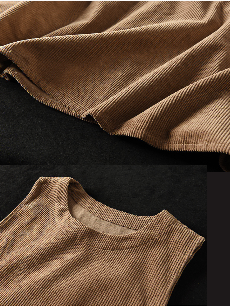 This autumn corduroy vest skirt is a loose sleeveless A-line dress in brown and black. It's made from a soft. durable corduroy material and features a round neckline. The dress has an easy pullover style that makes it easy to wear with just about anything. The length is 113cm / 44.4inch. which means you can wear it with flats for work or heels for a night out on the town! The bust size is 110cm / 43.3inch. which means it will fit most women comfortably without being too tight or too loose.