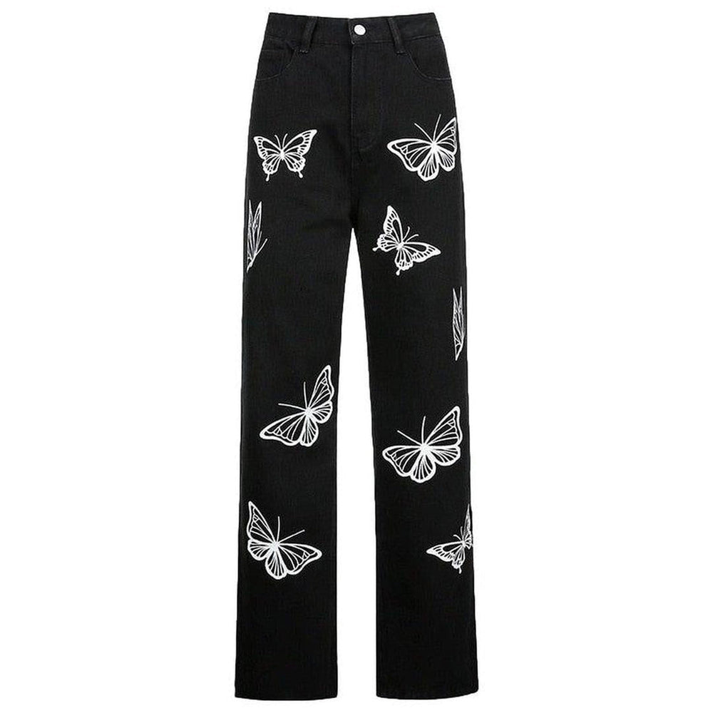 Slay in trend with the 2023 Autumn Collection's exquisite black jeans with butterflies. y2k style! Rich. radiant. and sanded to perfection. this high-waist. wide-leg masterpiece will ensure you make a statement wherever you go.