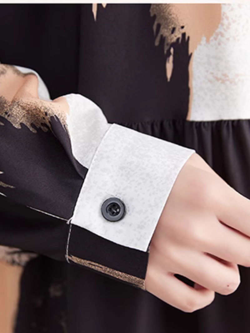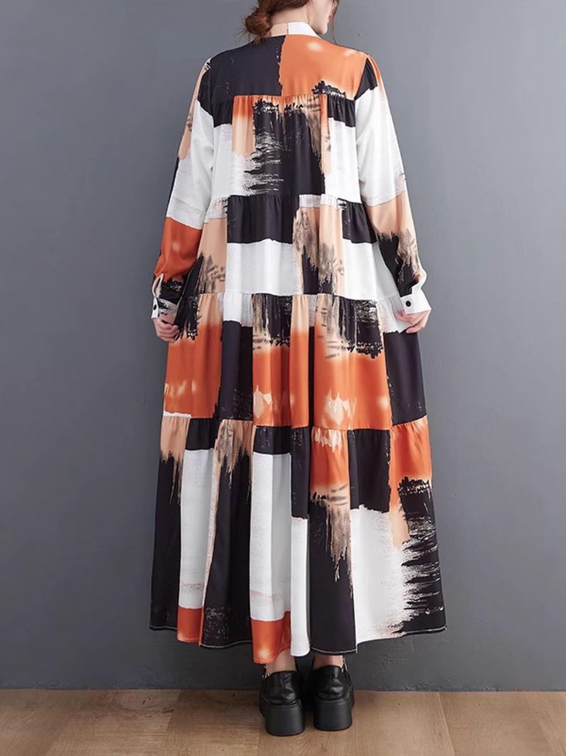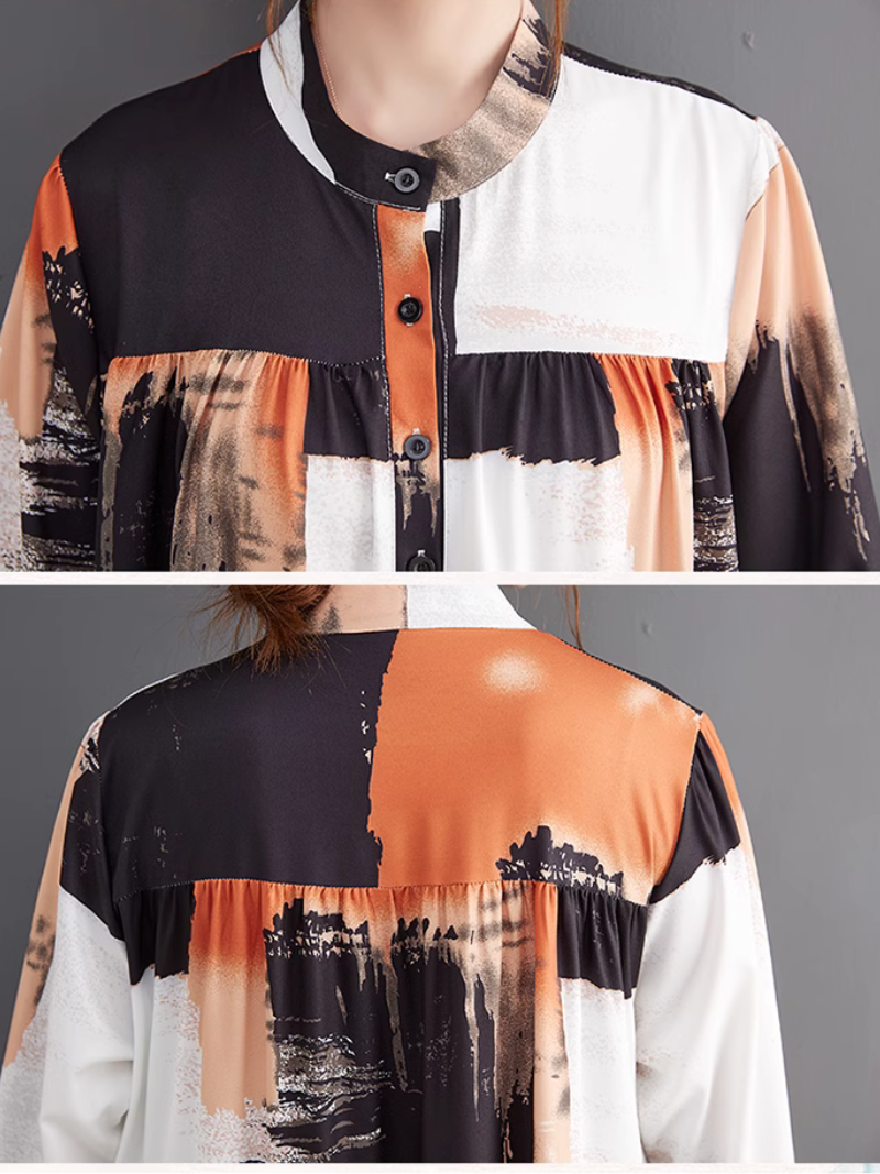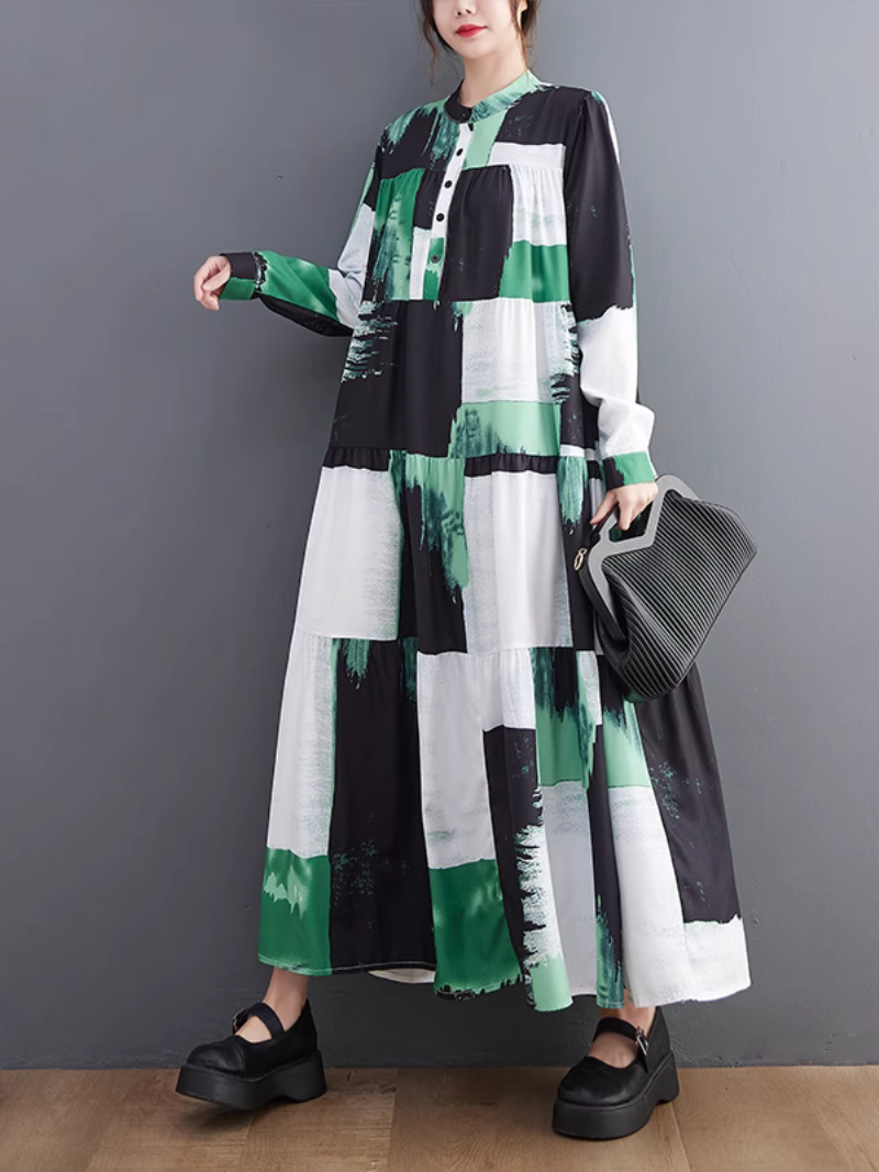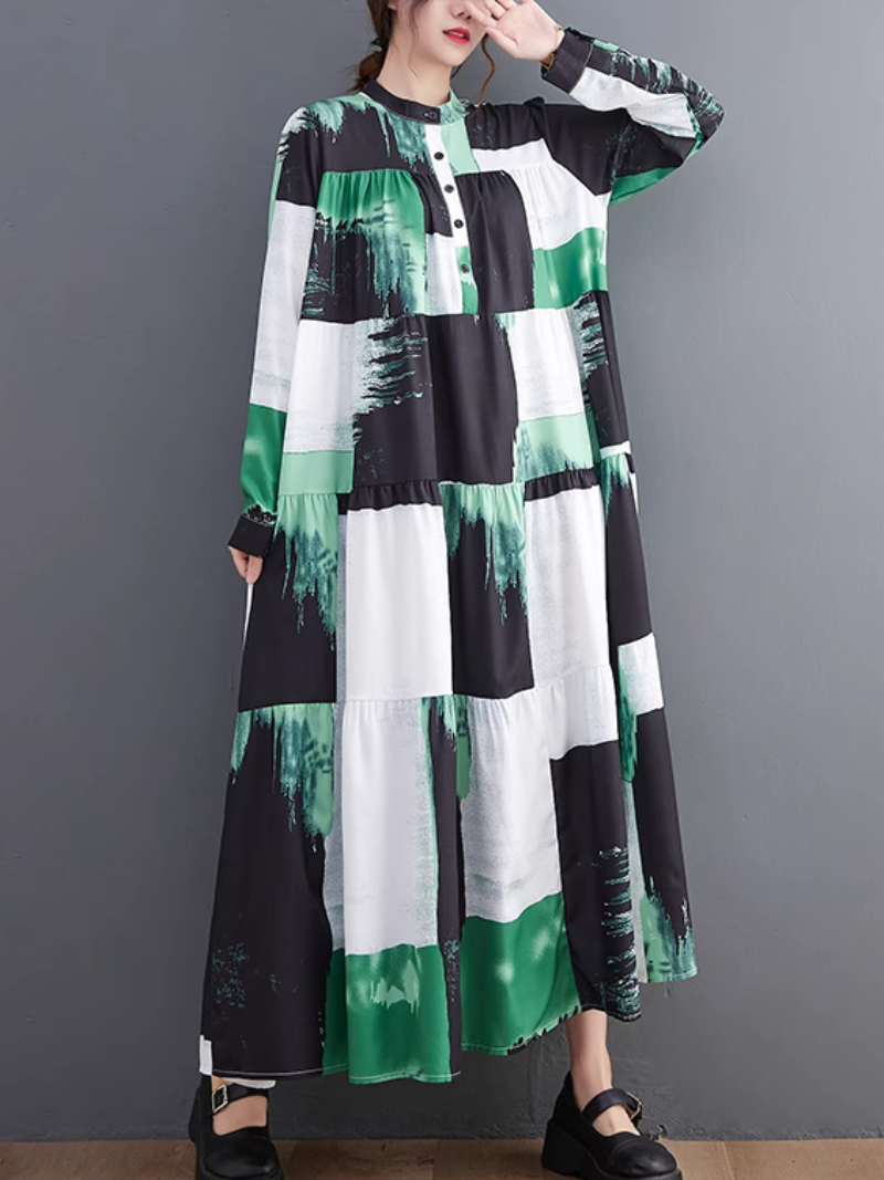 Women's Large Size Loose Printing Collar A-Line Dress. a blend of comfort and style designed for confident fashion enthusiasts. Crafted from a blend of soft cotton. it offers a luxurious feel. Available in striking green and vibrant orange. it's a perfect addition to your wardrobe. The long sleeves provide elegance. while the front buttons add a classic touch. The dress. offered in a free size. boasts a length of 125cm. bust measurement of 132cm. sleeves measuring 60cm. and shoulders of 39cm. Elevate your style effortlessly with this chic and comfortable A-line dress.