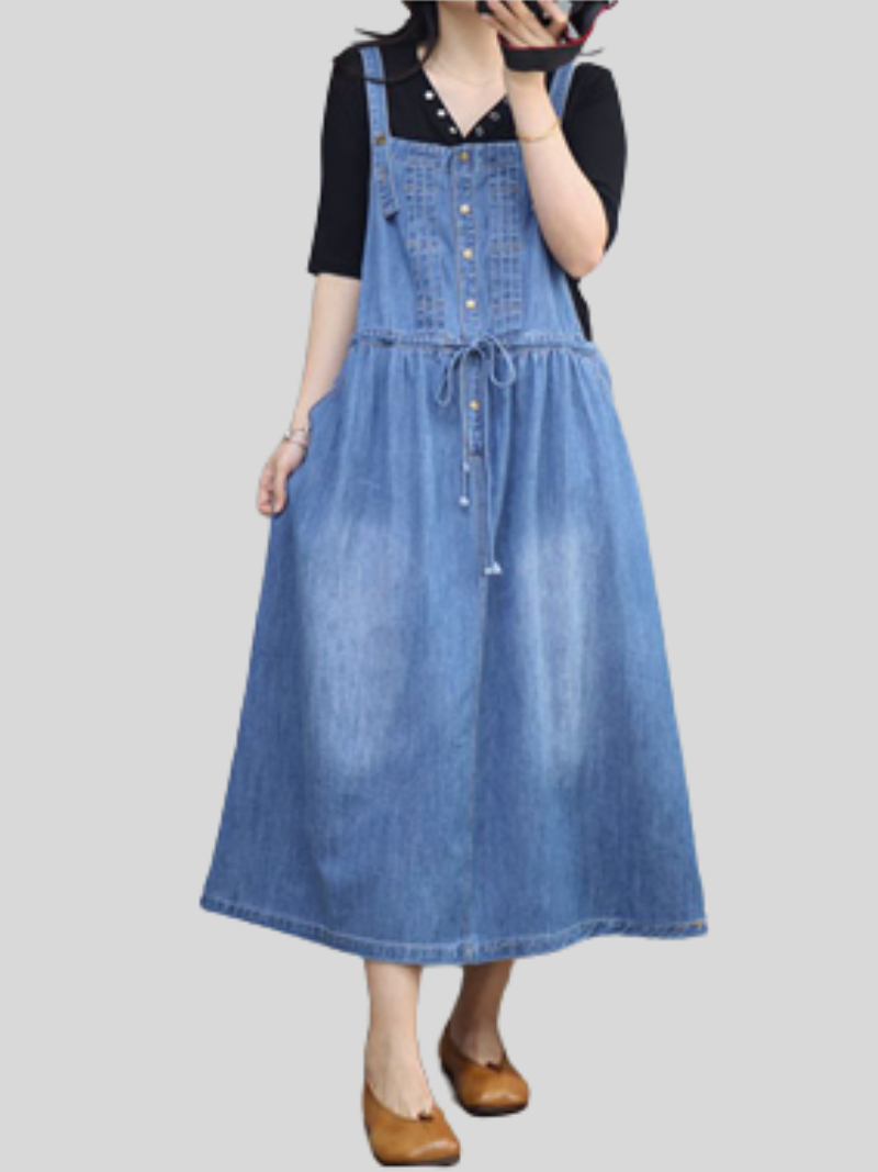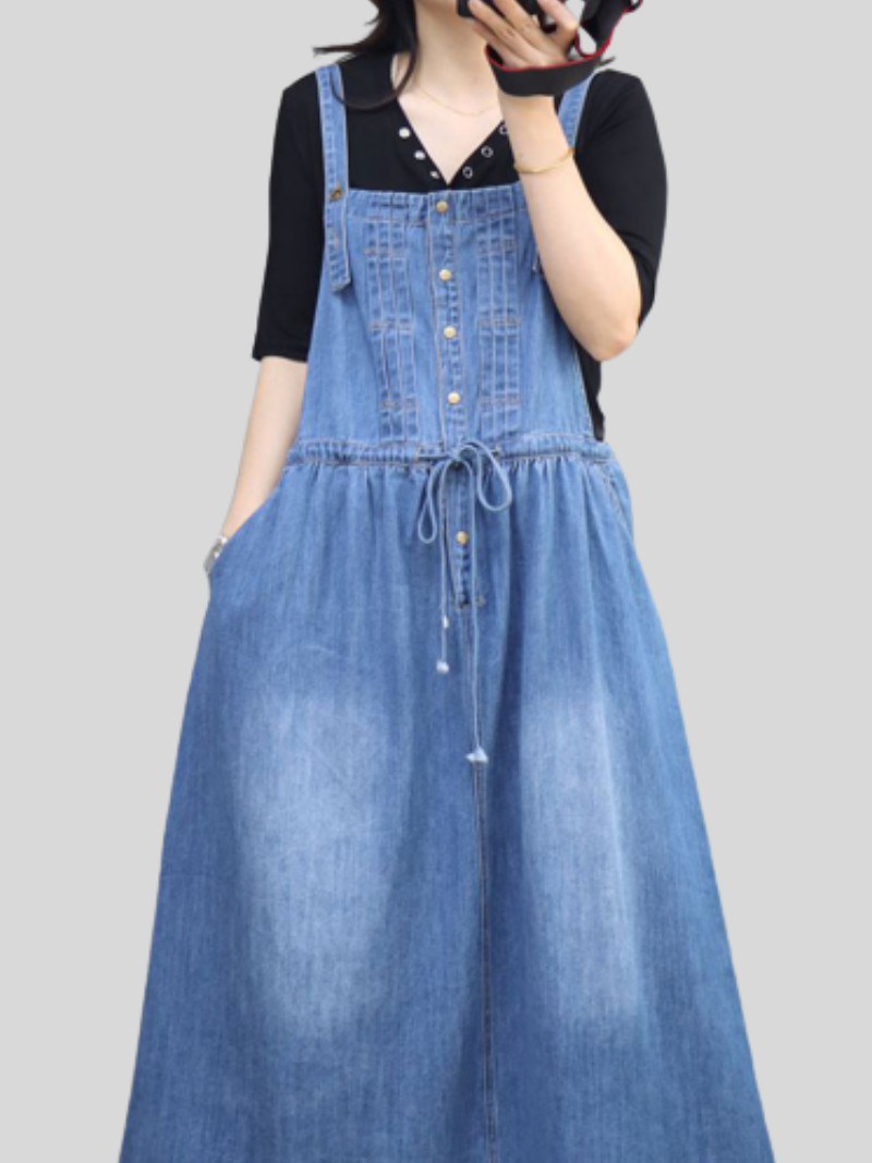 This stylish and trendy jumpsuit is made of high-quality denim material and is available in two classic colors - blue and gray. The jumpsuit has a unique strap style and sleeveless design. providing a comfortable and airy fit. Its high waist design flatters the figure and adds a touch of elegance to the overall look. The jumpsuit features a plain pattern. making it a versatile piece that can be paired with various accessories and footwear. Its high-quality denim material ensures durability and breathability. making it suitable for all seasons. This jumpsuit is a must-have addition to any wardrobe. providing a chic and effortless look that can be dressed up or down for various occasions. Its stylish design and comfortable fit make it perfect for any fashion-forward individual.